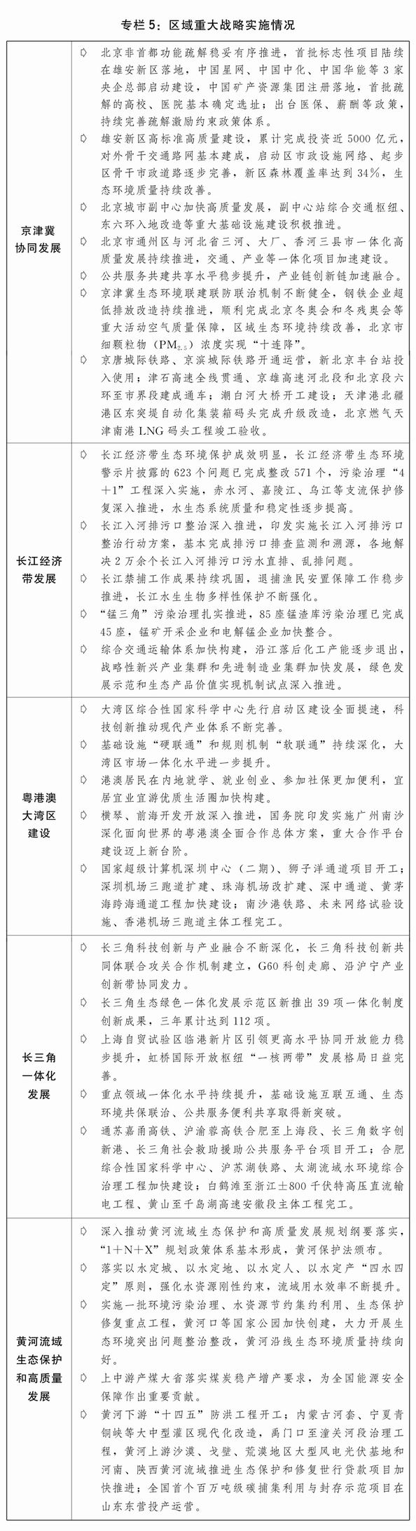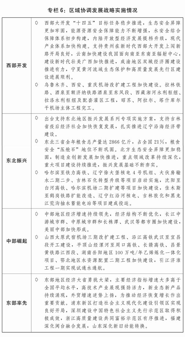 二是區域協調發展戰略深入實施。西部地區發展協調性持續提升,400毫米降水線西側區域保護發展穩步推進。支持東北地區振興發展系列專項實施方案出臺實施,東北地區維護國家糧食安全“壓艙石”地位持續鞏固。中部地區高質量發展重大工程加快建設,電子信息、新能源等戰略性新興產業集群快速發展。東部地區創新示范帶動作用持續發揮。加大特殊類型地區振興發展支持力度,革命老區振興發展、資源型地區和老工業城市轉型發展取得新進展,邊境地區基礎設施和城鎮建設步伐加快。民族地區經濟穩步發展。堅持陸海統籌,加強重點海域綜合治理,海洋強國建設加快推進。