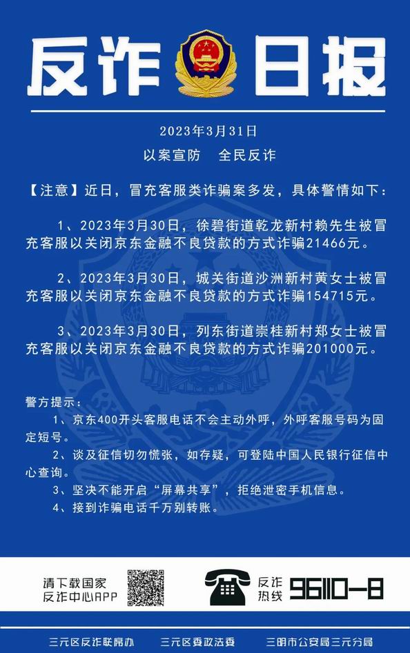 【3月31日】三元反詐日報:注意這類“京東客服”!輕信他口袋空空