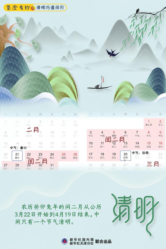農歷癸卯兔年的閏二月就是今年二月的閏月。這個閏二月從公歷3月22日開始到4月19日結束,中間只有一個節氣清明。 閏二月比較少見,就21世紀這100年而言,僅有四次,分別為2004年、2023年、2042年和2099年,而這四個年份的清明也都落在了閏二月。 “清明在公歷年中的日期是基本固定的,絕大多數年份為4月5日,個別年份為4月4日或4月6日,而閏二月的時間一般在公歷3月下旬至4月中旬,所以有閏二月的年份,清明必定落在閏二月里。2004年和2023年的清明落在閏二月十五,2042年和2099年的清明落在閏二月十四。”楊婧說。