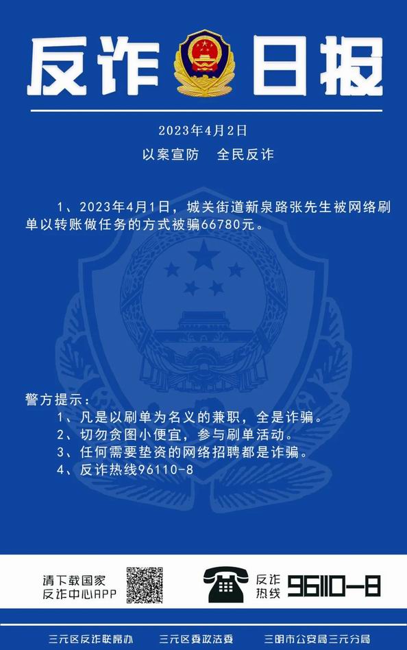 【4月2日】三元反詐日?qǐng)?bào):刷單皆詐騙 勸君莫上當(dāng)