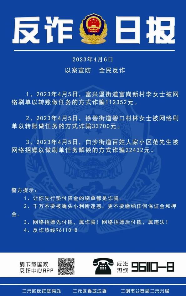 【4月6日】三元反詐日報:“招嫖色誘”“刷單返利”三元區這些人深陷詐騙“局中局”!