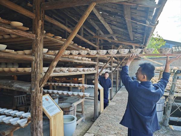 △陶陽里歷史文化街區(qū)里,工匠將陶瓷工藝品放到架上晾干。(總臺央視記者彭漢明拍攝) 一代代匠人勇于創(chuàng)新,才有了宋青白、元青花、明色釉、清粉彩這些耀古爍今的傳世經典。如今,科技賦能助力陶瓷制造走上工業(yè)化、智能化之路,3D打印技術讓人們的創(chuàng)意想法以“加速度”變成一件件陶瓷作品;業(yè)態(tài)創(chuàng)新催生陶瓷生產由傳統(tǒng)工業(yè)向創(chuàng)意產業(yè)轉型,古老的瓷器化身為時尚的“國潮”,傳統(tǒng)的老街成為“夜經濟”發(fā)達的文旅融合新地標。 習近平總書記多次強調,要推動中華優(yōu)秀傳統(tǒng)文化創(chuàng)造性轉化和創(chuàng)新性發(fā)展。 作為我國唯一的“國家陶瓷文化傳承創(chuàng)新試驗區(qū)”,景德鎮(zhèn)在新與舊的碰撞中不斷煥發(fā)出新的生機。 中外交融 續(xù)寫絲路精神 千百年來,絲路古道上的駝隊、鄭和下西洋的船隊,將景德鎮(zhèn)瓷器及制瓷技藝傳到亞洲、非洲、歐洲幾十個國家和地區(qū)。由最樸素的泥土燒制而成的瓷器,深受不同地區(qū)不同文化人們的共同喜愛,甚至被稱為“白色黃金”。大批身懷絕技的匠人也慕名而來,繪就了“工匠八方來、器成天下走”的繁榮景象。 景德鎮(zhèn)陶瓷,是中外文化交流的“使者”,更是絲路精神的見證。 2018年,由景德鎮(zhèn)始發(fā)的“中歐班列”正式開通,為當?shù)靥沾沙隹诖蜷_了一條新通道。景德鎮(zhèn)日用瓷、藝術瓷已出口30多個“一帶一路”共建國家,2022年全市出口額同比增長244.6%。