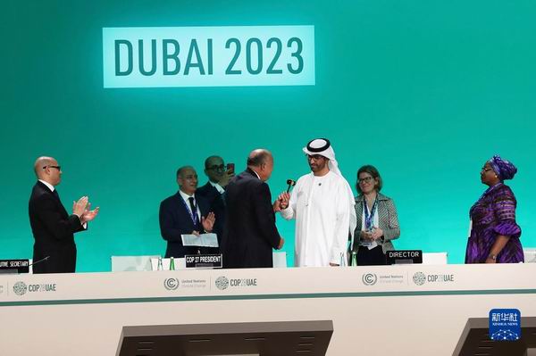 11月30日,在阿聯酋迪拜的聯合國氣候變化迪拜大會開幕現場,COP27主席舒凱里(前左)和COP28主席蘇爾坦·賈比爾(前右)交接主席職務。 新華社記者 王東震 攝 本屆大會計劃從11月30日持續至12月12日,主辦方預計將有超過7萬人參加,其中包括《公約》締約方代表、商界領袖、科學家、青年代表、媒體記者以及其他利益相關者等。 |