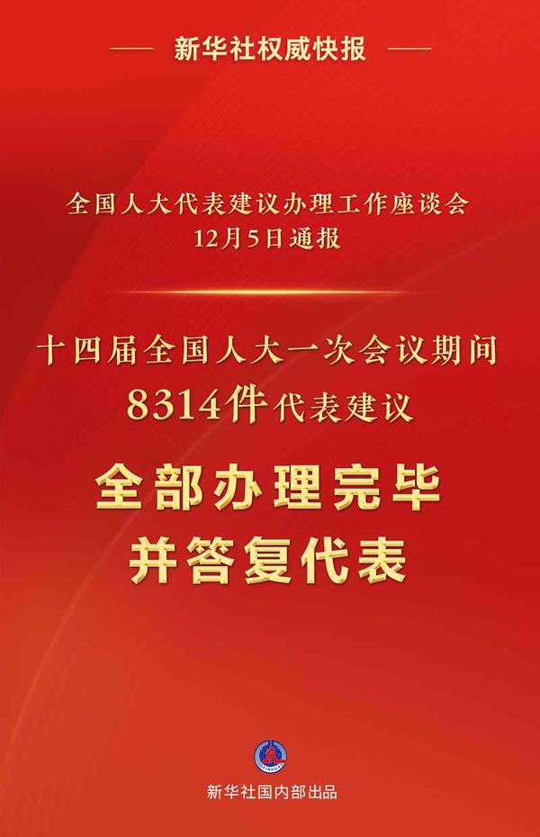 新華社石家莊12月5日電(記者任沁沁)記者5日從在河北正定舉行的全國人大代表建議辦理工作座談會(huì)上獲悉,十四屆全國人大一次會(huì)議期間代表們向大會(huì)提出的8314件建議,目前已經(jīng)全部辦理完畢并答復(fù)代表。 全國人大常委會(huì)代表工作委員會(huì)負(fù)責(zé)人介紹,今年3月十四屆全國人大一次會(huì)議期間,代表們依法履職,共提出建議8314件。其中涉及加快構(gòu)建新發(fā)展格局、著力推動(dòng)高質(zhì)量發(fā)展的占比為46.5%,涉及增進(jìn)民生福祉、提高人民生活品質(zhì)的占比為15.9%。代表們堅(jiān)持踐行全過程人民民主,密切聯(lián)系人民群眾,在調(diào)研、視察、座談、走訪等基礎(chǔ)上提出的建議比例不斷提高。