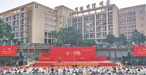 昨日,三明學院紀念辦學 120周年暨推進高質量發(fā)展大會在三明學院舉行。(三明日報記者 周志鴻 攝) 薪火相傳,弦歌不輟。12月10日,三明學院舉行紀念辦學120周年暨推進高質量發(fā)展大會。省人大常委會原副主任鄧力平,中國工程院院士盧耀如,中國科學院院士謝華安、謝素原,省廣播影視集團黨組書記、董事長曾祥輝,省人大常委會教科文衛(wèi)委副主任林和平,省政協(xié)教科衛(wèi)體委副主任劉健,省教育廳副廳長陳麗英,以及市領導李興湖、李春、賴碧濤、宋志強等受邀出席大會。三明學院黨委書記賴錦隆主持,校長張君誠致歡迎辭。 李興湖代表市四套班子向三明學院和全校師生、廣大校友表示誠摯祝賀。他說,120年來,三明學院始終與三明同呼吸、共命運,為三明注入了源源不斷的人才動力。希望三明學院扛牢“為黨育人、為國育才”的初心使命,立足三明、扎根八閩,努力培育更多堪當時代重任的棟梁之材,為三明全方位高質量發(fā)展作出更大貢獻。他表示,市委、市政府將一如既往支持學院發(fā)展,強化校地全方位聯(lián)動,全力推動學院揚特色、創(chuàng)一流,加快建成一流應用型大學。 陳麗英代表省委教育工委、省教育廳勉勵三明學院牢記習近平總書記重要囑托,全面貫徹落實黨的教育方針,強化黨的全面領導,堅持正確辦學方向,突出學科引領發(fā)展,圍繞中心服務大局,推動學校各項工作再上新臺階。她表示,省教育廳將進一步加大對三明學院的支持力度,為學校發(fā)展提供更優(yōu)服務、營造更好環(huán)境。 謝華安希望三明學院廣大教職員工立德修身、潛心治學、開拓創(chuàng)新,當好學生成長的引路人,培養(yǎng)更多社會需要的應用型人才。寄語學院青年學生立大志、明大德、成大才、擔大任,為中華民族偉大復興貢獻青春力量。 會上,合作高校代表廈門大學副校長鄧朝暉,校友代表俄羅斯工程院外籍院士、三峽實驗室主任池汝安,三明學院教師代表、學生代表分別致辭、發(fā)言,共有領導嘉賓、高校代表、師生校友代表3000多人參加。期間,還舉行校地、校校合作簽約,華東師范大學城市發(fā)展研究院三明分院和滬明綠色氟代制藥工程技術研究中心揭牌,捐贈授牌以及校史出版發(fā)布等活動。 (本報記者 章 龍 通訊員 吳愛娣) |