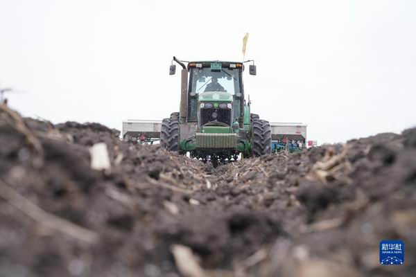 2023年4月12日,在黑龍江省北安市的北大荒集團建設農場有限公司一處農田中,許志國駕駛大型拖拉機進行分層定量施肥作業。 新華社記者 王松 攝 |