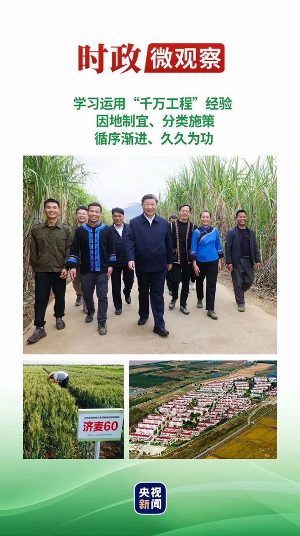 12月19日至20日,中央農(nóng)村工作會議在北京召開。會前,中央政治局常委會會議就開好這次會議,做好“三農(nóng)”工作提出明確要求。 習(xí)近平總書記從黨和國家事業(yè)發(fā)展的戰(zhàn)略全局出發(fā),對“三農(nóng)”工作作出重要指示,強調(diào)“推進中國式現(xiàn)代化,必須堅持不懈夯實農(nóng)業(yè)基礎(chǔ),推進鄉(xiāng)村全面振興”。 在我國,農(nóng)業(yè)是近兩億人就業(yè)的產(chǎn)業(yè),農(nóng)村是近5億農(nóng)民常住的家園,農(nóng)業(yè)農(nóng)村農(nóng)民問題是關(guān)系國計民生的根本性問題。 在中國式現(xiàn)代化的長卷中,農(nóng)村現(xiàn)代化該怎樣推進?如何扎實推動鄉(xiāng)村振興持續(xù)走深走實? 《時政微觀察》從鄉(xiāng)村振興的重中之重——產(chǎn)業(yè)振興的角度為你解讀。 學(xué)習(xí)運用“千萬工程”經(jīng)驗 習(xí)近平總書記明確指出:“把推進鄉(xiāng)村全面振興作為新時代新征程‘三農(nóng)’工作的總抓手,學(xué)習(xí)運用‘千萬工程’經(jīng)驗,因地制宜、分類施策,循序漸進、久久為功,集中力量抓好辦成一批群眾可感可及的實事。” “千萬工程”,即“千村示范、萬村整治”工程,是2003年習(xí)近平在浙江工作期間親自謀劃、親自部署、親自推動的一項重大工程。 “千萬工程”實施20年,探索出了一條加強農(nóng)村人居環(huán)境整治、全面推進鄉(xiāng)村振興、推動美麗中國建設(shè)的科學(xué)路徑。學(xué)習(xí)運用“千萬工程”不是要求全國都將浙江的鄉(xiāng)村振興模式作為“圖紙”來施工,而是要找準(zhǔn)切口、因地制宜,將地區(qū)優(yōu)勢轉(zhuǎn)化為發(fā)展勝勢,形成產(chǎn)業(yè)興、百姓富的良好局面。 把特色優(yōu)勢產(chǎn)業(yè)做強做大 廣西來賓市興賓區(qū)鳳凰鎮(zhèn),成片的甘蔗一眼望不到邊。 這里是來賓市國家現(xiàn)代農(nóng)業(yè)產(chǎn)業(yè)園黃安優(yōu)質(zhì)“雙高”糖料蔗基地,面積達(dá)1.3萬畝。 12月14日下午,正在廣西考察的習(xí)近平總書記來到這里,登上田間的八角樓二樓遠(yuǎn)眺。當(dāng)?shù)弥笮透收崾崭顧C一天能收割180噸至200噸甘蔗,相當(dāng)于180個人工的工作量,總書記連連稱贊。 在鳳凰鎮(zhèn)的一家制糖企業(yè),總書記詳細(xì)了解壓榨、制煉等制糖工藝和作業(yè)流程。“一根甘蔗實現(xiàn)‘吃干榨盡’。這是一個附加值很高的產(chǎn)業(yè)!”