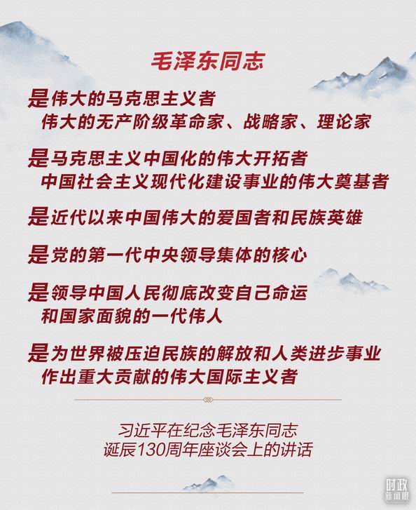今年12月26日,是毛澤東同志誕辰130周年紀念日。當天上午,中共中央在人民大會堂舉行座談會,紀念毛澤東同志誕辰130周年。習近平總書記發表重要講話。 總書記在座談會上說,“對毛澤東同志的最好紀念,就是把他開創的事業繼續推向前進。”如何推進這一偉大事業?總書記提出了明確要求,《時政新聞眼》為你解讀。 01“最好的紀念” 一代偉人的誕辰紀念,連接著歷史、現在和未來。 10年前的這一天,2013年12月26日,習近平總書記出席了紀念毛澤東同志誕辰120周年座談會。他說,“一切向前走,都不能忘記走過的路;走得再遠、走到再光輝的未來,也不能忘記走過的過去。” 相隔10年,在兩場座談會的講話中,總書記都高度評價了毛澤東同志的豐功偉績。 《時政新聞眼》注意到,與10年前的講話相比,總書記在今年這次座談會上增加了兩個新的表述:毛澤東同志是“中國社會主義現代化建設事業的偉大奠基者”,“是為世界被壓迫民族的解放和人類進步事業作出重大貢獻的偉大國際主義者”。