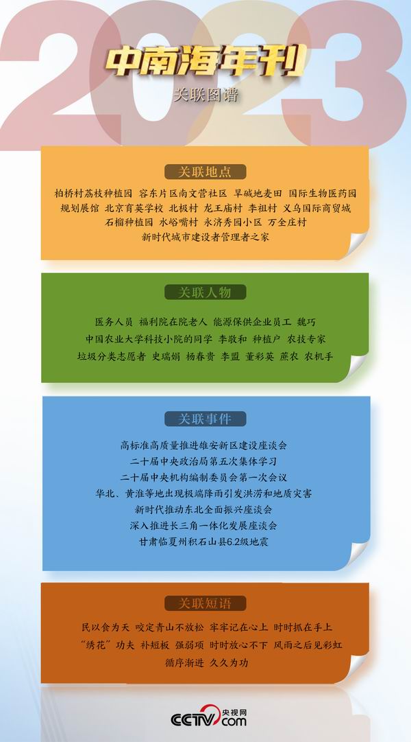 2023年12月11日,金華義烏國際商貿城,龍年喜慶用品掛滿攤位,顧客正在挑選中。 9月考察浙江,總書記從小商品看大市場,叮囑“拓展國內國際市場、暢通國內國際雙循環”。 11月考察北京、河北,總書記關注災后恢復重建工作,重點要求“抓緊補短板、強弱項”,著力“加快完善防洪工程體系、應急管理體系,不斷提升防災減災救災能力”。 12月考察廣西,總書記調研現代農業產業園,要求探索“建立更加穩定的利益聯結機制”,讓廣大農民共享農村改革和發展成果。 ………… 在關聯短語中,我們可以看到“民以食為天”這樣關乎百姓“幸福指數”的俗語,可以看到“咬定青山不放松”“風雨之后見彩虹”這樣堅定的歷史主動,更可以看到中國式現代化“循序漸進”“久久為功”的嶄新未來。 民生改善“沒有最好,只有更好”。正如習近平總書記所強調的:“保障和改善民生是一項長期工作,沒有終點站,只有連續不斷的新起點。” 總監制丨駱紅秉 魏驅虎 監 制丨王敬東 視 覺丨張紫曦 陳騰 劉京京 校 對丨孫曉媛 孫潔 宋春燕 梁雅琴 范立君 出 品丨中央廣播電視總臺央視網 |