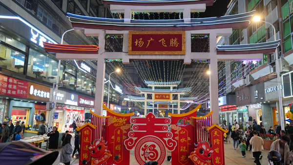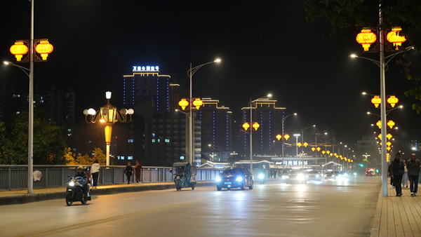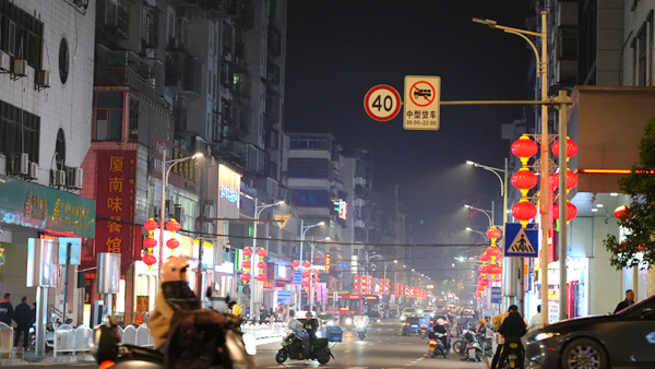 夜幕降臨,華燈初上。白天街景熱熱鬧鬧,夜晚同樣流光溢彩,高掛的燈籠氤氳著祥和暖意,一路璀璨生輝,點亮了游子的歸家路。