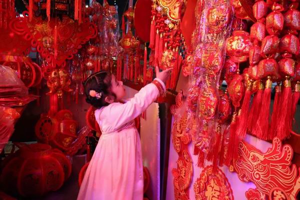 攤位上,紅彤彤的燈籠、春聯、五福掛件、年畫、福字等春節飾品應有盡有,營造出紅紅火火的喜慶氛圍。