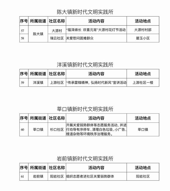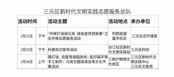 晚云開,朝雪霽,時節又燈市。 在元宵佳節和“3·5”學雷鋒日來臨之際, 三元區新時代文明實踐中心 結合“我們的節日·元宵” 廣泛開展各類新時代文明實踐活動。 快到家門口的新時代文明實踐站一起鬧元宵吧! 活動主題:歡喜鬧元宵 暖心學雷鋒 活動時間:2月23日(星期五)下午3:00——5:00 報名方式: ①到所在地社區報名; ②2月22日可登錄“志愿三明”信息平臺,搜索您想要參加的活動,報名參與。 ③同時,三元區新時代文明實踐志愿服務總隊也將開展形式多樣的活動,具體如下。