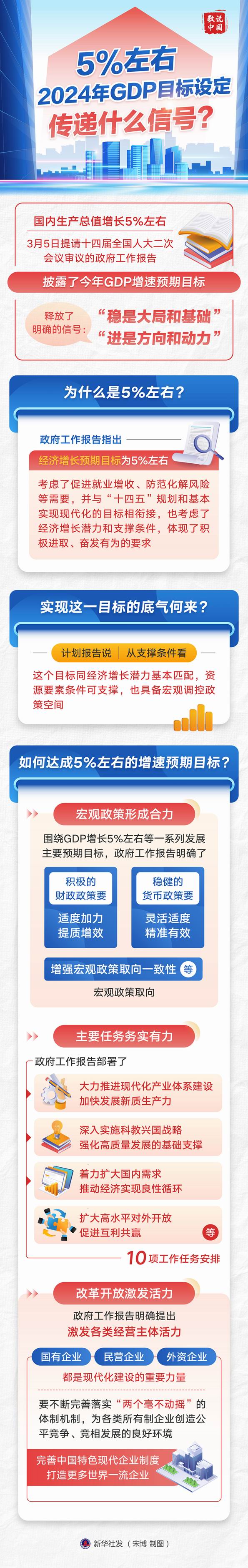 新華社北京3月5日電 題:5%左右, 2024年GDP目標設定傳遞什么信號? 新華社記者謝希瑤、戴小河、岳德亮 國內生產總值增長5%左右——5日提請十四屆全國人大二次會議審議的政府工作報告,披露了今年GDP增速預期目標。這個數據對于引導市場預期、指導宏觀調控具有重要意義,歷來是兩會上受到高度關注的焦點。 今年的目標釋放了明確的信號:“穩是大局和基礎”“進是方向和動力”。 為什么是5%左右? 政府工作報告指出,經濟增長預期目標為5%左右,考慮了促進就業增收、防范化解風險等需要,并與“十四五”規劃和基本實現現代化的目標相銜接,也考慮了經濟增長潛力和支撐條件,體現了積極進取、奮發有為的要求。 全國政協委員、中國社會科學院經濟研究所所長黃群慧說,這一增速預期目標,是在正常基數上的中高速增長,實際增長將高于去年,體現了對經濟運行態勢的科學研判和積極進取的導向。 當天提請會議審查的計劃報告,進一步闡述了對于這一目標設定的考慮:從客觀需要看,我國仍是發展中國家,正處于全面建設社會主義現代化國家的關鍵時期,有效應對外部環境變化挑戰,在發展中破解各種矛盾問題,調整優化經濟結構、穩定和擴大就業、增加居民收入、防范化解重點領域風險、增強發展信心,都需要保持一定的經濟增長速度。 值得注意的是,這個目標也兼顧當前和長遠,符合 “十四五”規劃目標要求,著眼到2035年基本實現社會主義現代化目標任務,也有利于加快經濟結構優化、產業結構調整。 實現這一目標的底氣何來? 政府工作報告指出,綜合分析研判,今年我國發展面臨的環境仍是戰略機遇和風險挑戰并存,有利條件強于不利因素。 計劃報告說,從支撐條件看,這個目標同經濟增長潛力基本匹配,資源要素條件可支撐,也具備宏觀調控政策空間。 全國政協委員、北京大學新結構經濟學研究院院長林毅夫說,我國經濟還有很大發展潛力,若能用好顯著的制度優勢、超大規模市場的需求優勢、產業體系完備的供給優勢、高素質勞動者眾多的人才優勢,并妥善應對風險挑戰,完全有可能實現平穩中高速增長。 如何達成5%左右的增速預期目標? ——宏觀政策形成合力。 一般公共預算支出規模比上年增加1.1萬億元;擬安排地方政府專項債券比上年增加1000億元;從今年開始擬連續幾年發行超長期特別國債,專項用于國家重大戰略實施和重點領域安全能力建設,今年先發行1萬億元;保持流動性合理充裕…… 圍繞GDP增長5%左右等一系列發展主要預期目標,政府工作報告明確了“積極的財政政策要適度加力、提質增效”“穩健的貨幣政策要靈活適度、精準有效”“增強宏觀政策取向一致性”等宏觀政策取向。 ——主要任務務實有力。 政府工作報告部署了“大力推進現代化產業體系建設,加快發展新質生產力”“深入實施科教興國戰略,強化高質量發展的基礎支撐 ”“著力擴大國內需求,推動經濟實現良性循環”“擴大高水平對外開放,促進互利共贏”等10項工作任務安排。 全國人大代表、中國科學院科技戰略咨詢研究院院長潘教峰說,這些重點任務兼顧需求和供給,著眼國內國際兩個市場,既針對當務之急、也布局長久之計,且相互支撐、彼此促進,有助于我國經濟在應對挑戰中把握機遇。 ——改革開放激發活力。 政府工作報告明確提出,激發各類經營主體活力。國有企業、民營企業、外資企業都是現代化建設的重要力量。要不斷完善落實“兩個毫不動搖”的體制機制,為各類所有制企業創造公平競爭、競相發展的良好環境。完善中國特色現代企業制度,打造更多世界一流企業。 全國政協委員、正泰集團董事長南存輝說,5%左右的增速目標為企業提供了可預期的經濟發展環境,我們將繼續打“創新牌”、吃“改革飯”、走“開放路”。 政府工作報告強調,實現今年預期目標并非易事,需要政策聚焦發力、工作加倍努力、各方面齊心協力。