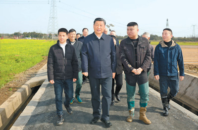 3月18日至21日,中共中央總書記、國家主席、中央軍委主席習近平在湖南考察。這是19日下午,習近平在常德市鼎城區謝家鋪鎮港中坪村,同種糧大戶、農技人員、基層干部親切交流。 新華社記者 鞠 鵬攝