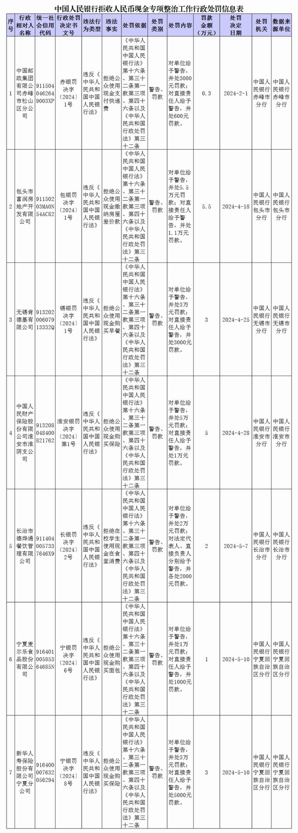 中國人民銀行5月14日對外公布,2024年1月以來,中國人民銀行依法對中國郵政集團有限公司赤峰市松山區分公司等7家拒收人民幣現金的單位及相關責任人作出經濟處罰,對單位的處罰金額從3000元至5.5萬元人民幣不等。 記者梳理發現,此次被曝光的單位包括郵政公司、房地產公司、餐飲公司、保險公司等。有的公司拒絕公眾使用現金支付快遞費,個別房地產公司拒絕公眾使用現金繳納房屋差價款,有的餐飲公司拒絕公眾使用現金購買早餐,還有保險公司拒絕公眾使用現金購買保險……