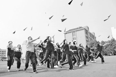 5月24日,中學生在山東濰坊高密市第五中學放飛寫有高考心愿的紙飛機。李海濤攝/光明圖片