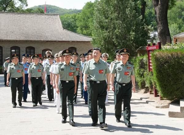 6月17日至19日,中央軍委政治工作會議在陜西延安召開。中共中央總書記、國家主席、中央軍委主席習(xí)近平出席會議并發(fā)表重要講話。這是17日下午,習(xí)近平帶領(lǐng)軍委一班人和各部門各單位主要負(fù)責(zé)同志瞻仰王家坪革命舊址。新華社記者 李剛 攝 寶塔山下,延河水畔,革命圣地延安滿目蔥蘢,生機(jī)盎然。17日下午3時(shí)許,習(xí)近平帶領(lǐng)軍委一班人和各部門各單位主要負(fù)責(zé)同志瞻仰王家坪革命舊址。王家坪是1937年8月至1947年3月中央軍委駐地,是延安時(shí)期黨中央和中央軍委重要決策指揮中心。在中央軍委會議室,習(xí)近平認(rèn)真聽取講解,觀看反映延安時(shí)期重大戰(zhàn)役運(yùn)籌指揮情況的歷史圖表,感悟黨中央和中央軍委的領(lǐng)導(dǎo)智慧和藝術(shù)。習(xí)近平來到毛澤東、周恩來、朱德等老一輩革命家舊居,重溫老一輩革命家在延安的革命經(jīng)歷,緬懷他們的豐功偉績。途經(jīng)“桃林廣場”,習(xí)近平了解陜甘寧邊區(qū)創(chuàng)造性開展雙擁運(yùn)動的情況,同大家共同回味當(dāng)年充滿革命樂觀主義精神的戰(zhàn)斗生活。在中央軍委禮堂,習(xí)近平仔細(xì)觀看歷史照片,同大家深入交流,回顧黨中央和中央軍委領(lǐng)導(dǎo)全民族抗戰(zhàn)和解放戰(zhàn)爭的光輝歷程。習(xí)近平指出,10年前我們到古田召開全軍政治工作會議,今天我們來延安召開軍委政治工作會議,再一次尋根溯源。新時(shí)代新征程,強(qiáng)國強(qiáng)軍前景光明,任務(wù)艱巨。全軍高級干部要牢記初心使命,帶頭弘揚(yáng)延安精神,帶頭加強(qiáng)革命性鍛造,扛起黨和人民賦予的歷史重任,團(tuán)結(jié)帶領(lǐng)廣大官兵打好實(shí)現(xiàn)建軍一百年奮斗目標(biāo)攻堅(jiān)戰(zhàn),把強(qiáng)軍事業(yè)不斷推向前進(jìn)。