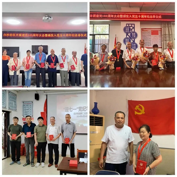 二、“光榮在黨50年”,紅色基因傳薪火 五十載崢嶸歲月,五十載黨齡芳華。一枚枚璀璨的紀念章,見證了老一輩共產黨員篳路藍縷、創業維艱的崢嶸歲月,展現了老一輩共產黨員頑強奮斗、堅韌前行的精神品質。連日來,白沙社區、橋西社區、白沙村等5個村居黨組織分別舉辦“光榮在黨50年”紀念章頒發儀式,為26名黨齡達到50周年的老黨員頒發“光榮在黨五十周年”紀念章。