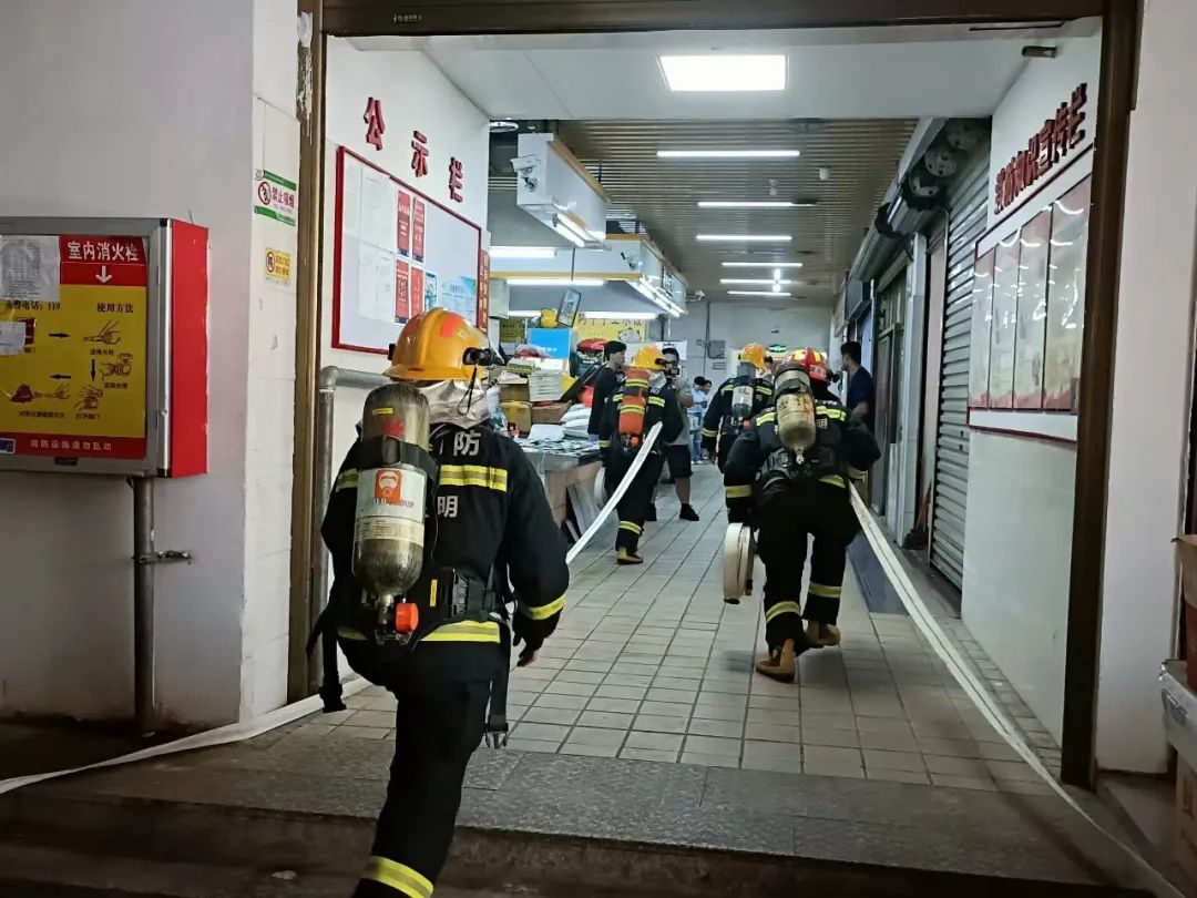 演練模擬三明市綜合市場內8號攤位發生火災,攤主報警求援,現場火勢大且有人員被困。市場服務中心工作人員迅速啟動應急預案,滅火組前往滅火,警戒組維持秩序,疏散組引導人員疏散,救護組負責搜救和急救傷員。
