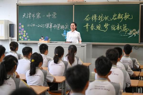 2024年9月1日,天津一中教師在課堂上寄語學生,迎接新學期的到來。新華社記者 孫凡越 攝 “心有大我、至誠報國的理想信念,言為士則、行為世范的道德情操,啟智潤心、因材施教的育人智慧,勤學篤行、求是創新的躬耕態度,樂教愛生、甘于奉獻的仁愛之心,胸懷天下、以文化人的弘道追求”。2023年教師節前夕,習近平總書記精辟概括了中國特有的教育家精神。 思想精辟深邃,情懷深厚綿長。 黨的十八大以來,習近平總書記深刻闡述了教育在黨和國家事業全局中的重要地位和作用,科學回答了一系列中國特色社會主義教育事業發展的重大理論和實踐問題—— 明確“培養什么人、怎樣培養人、為誰培養人是教育的根本問題”,指出“我們的教育絕不能培養社會主義破壞者和掘墓人,絕不能培養出一些‘長著中國臉,不是中國心,沒有中國情,缺少中國味’的人!那將是教育的失敗”。 明確“以堅持黨對教育事業的全面領導為根本保證”,強調“我們黨立志于中華民族千秋偉業,必須培養一代又一代擁護中國共產黨領導和我國社會主義制度、立志為中國特色社會主義事業奮斗終身的有用人才”。 明確“以立德樹人為根本任務”,要求“把立德樹人的成效作為檢驗學校一切工作的根本標準,真正做到以文化人、以德育人,不斷提高學生思想水平、政治覺悟、道德品質、文化素養,做到明大德、守公德、嚴私德”。 …… 一系列新思想新觀點新論斷,闡明了新時代中國特色社會主義教育發展方向、道路、方針、原則等根本性戰略性問題,以全新視野深化了對社會主義建設規律、教育發展規律、人才培養規律的認識,為加快推進教育現代化、建設教育強國、辦好人民滿意的教育提供了根本遵循和行動指南。 綱舉目張 步履鏗鏘——“要堅持把高質量發展作為各級各類教育的生命線,加快建設高質量教育體系” 2021年6月29日,北京人民大會堂,黨中央首次頒授“七一勛章”。