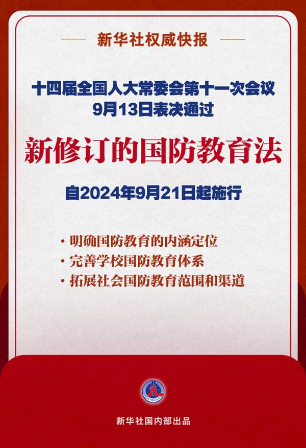 新華社北京9月13日電(記者白陽)十四屆全國人大常委會第十一次會議9月13日表決通過新修訂的國防教育法,自2024年9月21日起施行。 國防教育是建設和鞏固國防的基礎,是增強民族凝聚力、提高全民素質的重要途徑。修訂后的國防教育法共六章,包括總則、學校國防教育、社會國防教育、國防教育保障、法律責任及附則。 修訂后的國防教育法明確了國防教育的內涵定位,明確國防教育的指導思想,明確國防教育領導體制和工作職責,完善學校國防教育體系,拓展社會國防教育范圍和渠道,加強國防教育的保障等。 本法規定,國家在全體公民中開展以愛國主義為核心,以履行國防義務為目的,與國防和軍隊建設有關的理論、知識、技能以及科技、法律、心理等方面的國防教育。 在學校國防教育方面,明確學校國防教育是全民國防教育的基礎,是實施素質教育的重要內容。本法著眼于構建各級各類學校相互銜接的國防教育體系,對小學和初級中學、高中階段學校、普通高等學校的國防教育目標、內容和方法途徑等進行了補充完善。 在社會國防教育方面,本法與預備役人員法有關規定相銜接,明確預備役人員所在單位應當按照有關規定開展預備役人員教育訓練。國家機關工作人員應當具備較高的國防素養,發揮在全民國防教育中的模范帶頭作用。 修訂后的國防教育法還對媒體網絡和文化傳播、群眾性國防教育活動、國防教育場所等作出規范。 |