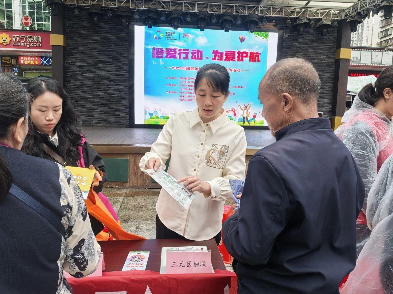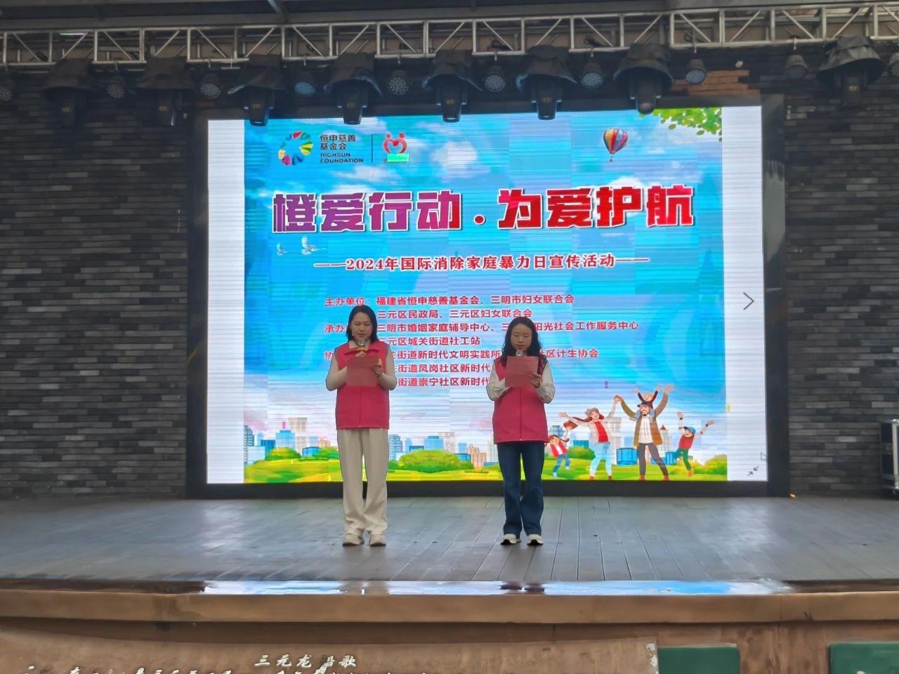 為切實增強廣大婦女和家庭的反家暴意識,有效預防和制止家庭暴力,營造全社會共同反對家庭暴力、維護婦女合法權益的良好氛圍,11月20日,在“國際反家庭暴力日”到來之際,三元區婦聯聯合福建省恒申慈善基金會、市婦聯、市婚姻家庭輔導中心、陽光社會工作服務中心等單位在三元區城關街道騰飛廣場聯合舉辦“橙愛行動·為愛護航”——國際消除家庭暴力日宣傳活動。