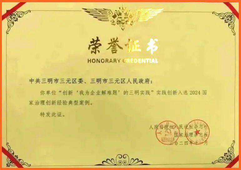11月21日 ,由人民日報社指導、人民日報社人民論壇雜志社主辦的“2024國資國企高質量發展峰會——第十屆國家治理高峰論壇”活動在北京舉行。會上發布了“2024國資國企高質量發展暨國家治理創新經驗課題調研成果”,三元區的“創新'我為企業解難題'的三明實踐”成功入選國家治理創新經驗典型案例,成為福建省唯一入選案例。
