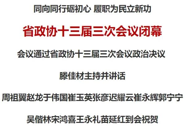 16日上午,省政協(xié)十三屆三次會議圓滿完成各項(xiàng)議程,在福州閉幕。 大會執(zhí)行主席滕佳材、黃海昆、張兆民、黃文輝、王光遠(yuǎn)、阮詩瑋、劉獻(xiàn)祥、嚴(yán)可仕、余軍、張國旺、黃玲、黃如欣、邱天華在主席臺前排就座。 省委書記、省人大常委會主任周祖翼,省委副書記、省長趙龍,全國人大、全國政協(xié)專委會領(lǐng)導(dǎo)于偉國、崔玉英,省領(lǐng)導(dǎo)張彥、遲耀云、崔永輝、郭寧寧、吳偕林、宋鴻喜、王永禮、苗延紅到會祝賀。 滕佳材主持會議并講話。他說,這次全會是在“十四五”規(guī)劃收官之年、新時代新福建建設(shè)關(guān)鍵時刻召開的一次重要會議,省委高度重視,委員熱情參與,社會持續(xù)關(guān)注。周祖翼書記、趙龍省長等領(lǐng)導(dǎo)同志出席開幕會和閉幕會,聽取大會發(fā)言,參加小組和聯(lián)組討論,會見港澳臺僑人士,共商新福建建設(shè)大計(jì)、共謀高質(zhì)量發(fā)展良策。省委、省人大常委會、省政府、省兩院、駐閩部隊(duì)的領(lǐng)導(dǎo)和省級老同志,以及省直有關(guān)部門、社會有關(guān)方面給予了大力支持。廣大委員以飽滿的政治熱情、強(qiáng)烈的責(zé)任擔(dān)當(dāng)、昂揚(yáng)的精神狀態(tài),認(rèn)真審議和討論各項(xiàng)報(bào)告,并通過反映社情民意信息、提交提案、分組討論等形式,踴躍發(fā)言、積極建言,提出了許多有深度、高質(zhì)量、接地氣的真知灼見,充分展現(xiàn)了胸懷大局、情系民生的履職風(fēng)采。 滕佳材指出,站在“兩個大局”同步交織、兩個“五年規(guī)劃”相互交接的新起點(diǎn)上,我們對共同創(chuàng)造的歷史豪情滿懷,對開創(chuàng)未來的征程信心百倍。全省各級政協(xié)組織、政協(xié)各參加單位和全體政協(xié)委員要旗幟鮮明講政治,始終堅(jiān)持用習(xí)近平新時代中國特色社會主義思想明德修身,以高尚人格感染人、模范行為引導(dǎo)人、獨(dú)特魅力凝聚人,以實(shí)際行動堅(jiān)定擁護(hù)“兩個確立”,堅(jiān)決做到“兩個維護(hù)”。要協(xié)商資政見水平,始終秉承人民政協(xié)的優(yōu)良傳統(tǒng),善謀穩(wěn)中求進(jìn)實(shí)招、勇探奮勇爭先新路、多獻(xiàn)高質(zhì)量發(fā)展良策,持續(xù)打造“協(xié)商”品牌、強(qiáng)化“監(jiān)督”力量、彰顯“專門”優(yōu)勢。要履職為民礪初心,始終牢記政協(xié)前面的“人民”二字,把民生“頭等大事”協(xié)商深,把群眾“關(guān)鍵小事”商量好,以扎扎實(shí)實(shí)的履職實(shí)效反映心聲、回饋民聲、贏得掌聲,以為閩協(xié)商、為民服務(wù)的使命擔(dān)當(dāng),奮力開創(chuàng)我省政協(xié)事業(yè)新局面,在新時代新福建建設(shè)的火熱實(shí)踐中再創(chuàng)佳績、再展風(fēng)采。 滕佳材說,大道如砥,大勢如潮。崇高的使命召喚我們奮勇爭先,壯闊的前景激勵我們接續(xù)奮斗。讓我們更加緊密地團(tuán)結(jié)在以習(xí)近平同志為核心的中共中央周圍,高舉習(xí)近平新時代中國特色社會主義思想偉大旗幟,在中共福建省委領(lǐng)導(dǎo)下,同向同行、群策群力,為奮力譜寫中國式現(xiàn)代化福建篇章作出更大貢獻(xiàn)!
