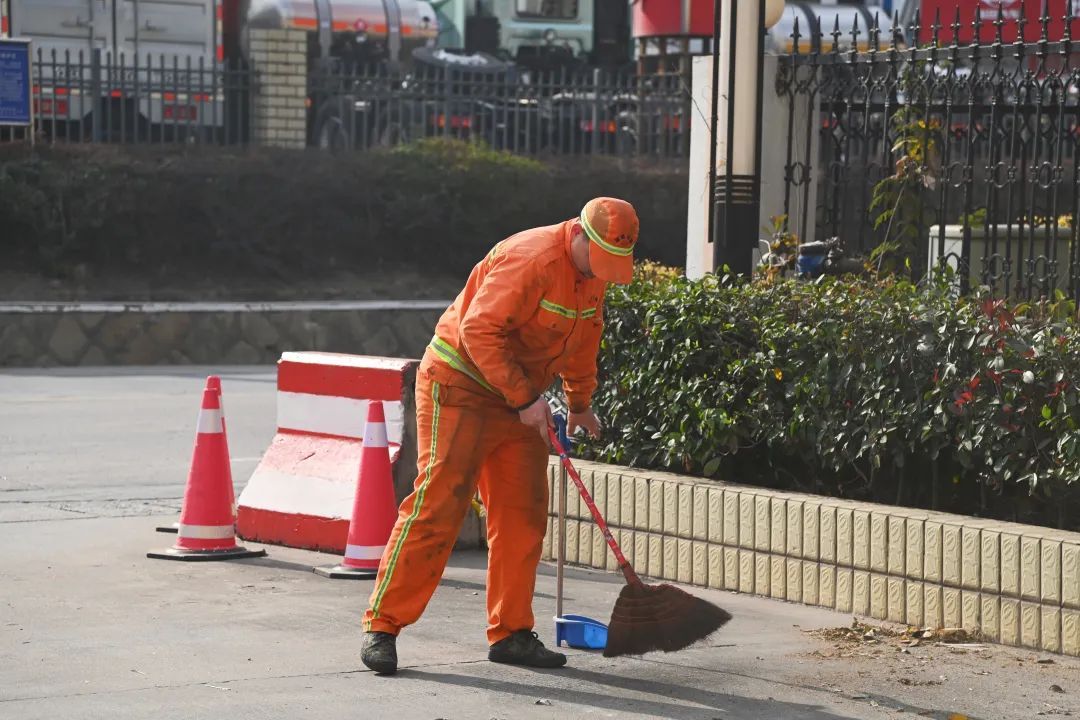 荊東公路站工人打掃停車區(qū)