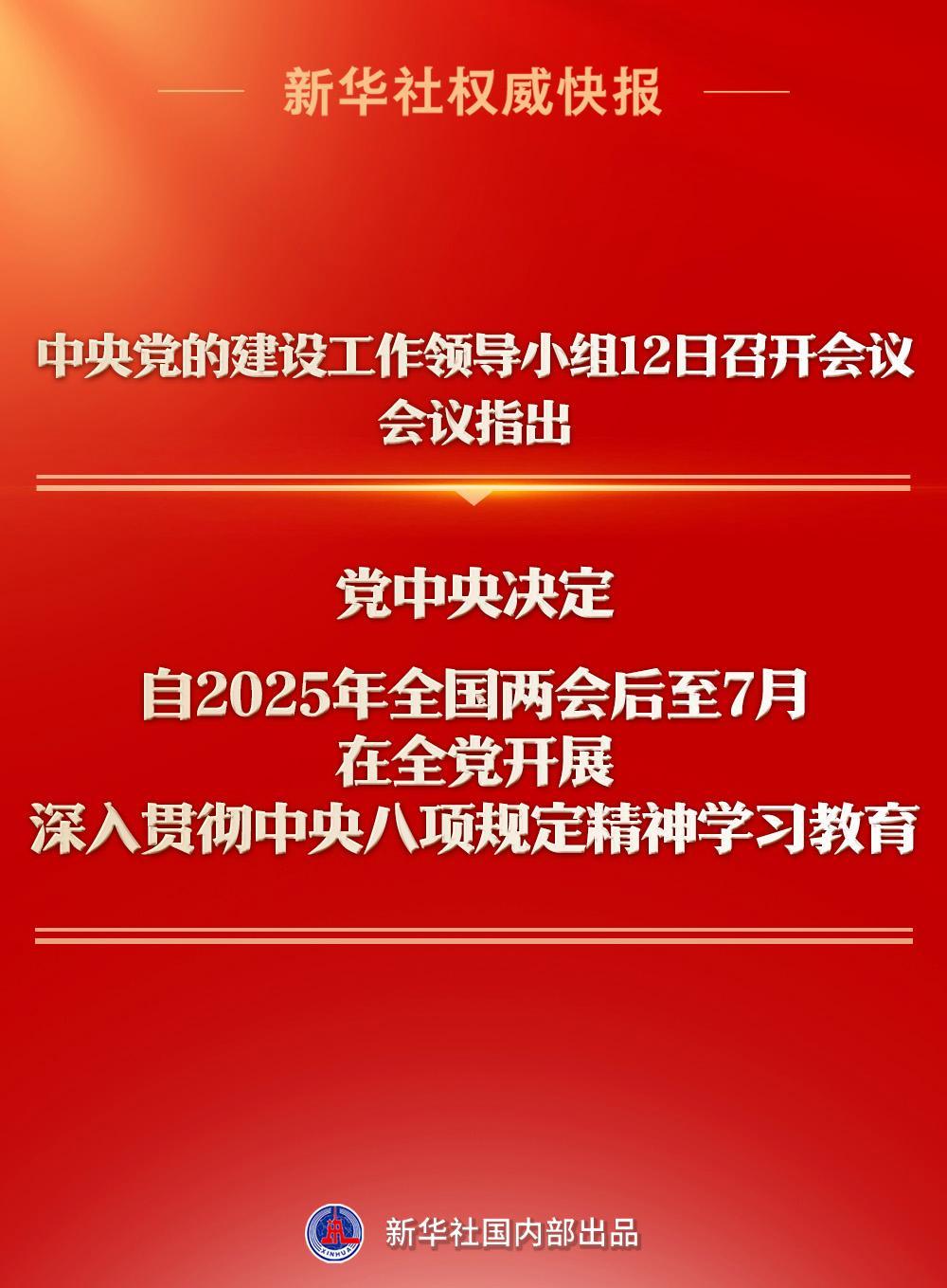 中央黨的建設(shè)工作領(lǐng)導(dǎo)小組12日召開會議,學(xué)習(xí)貫徹習(xí)近平總書記關(guān)于深入貫徹中央八項規(guī)定精神學(xué)習(xí)教育的重要講話和重要指示精神,研究部署學(xué)習(xí)教育工作。 會議指出,黨中央決定,自2025年全國兩會后至7月在全黨開展深入貫徹中央八項規(guī)定精神學(xué)習(xí)教育。