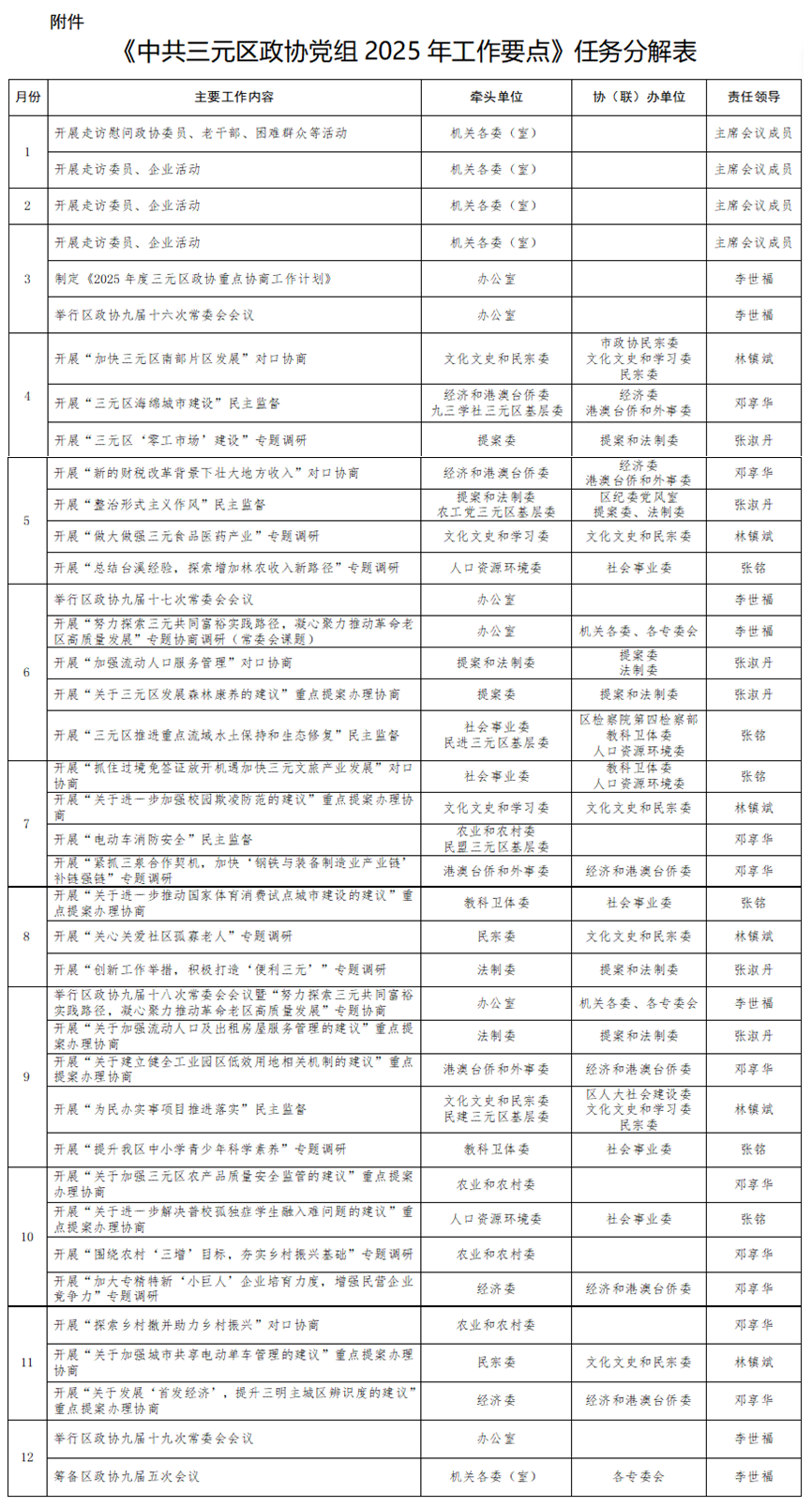 元協黨組〔2025〕5號 中共三元區政協黨組關于印發《中共三元區政協黨組2025年工作要點》的通知 區政協機關黨支部、區政協各專委會、各鄉鎮(街道)政協委員聯絡組、區政協機關各委室: 現將《中共三元區政協黨組2025年工作要點》印發給你們,請結合實際認真貫徹執行。 中共三元區政協黨組 2025年3月12日 中共三元區政協黨組2025年工作要點 2025年是深入貫徹中共二十屆三中全會精神,推動“十四五”規劃收官、謀劃“十五五”規劃的關鍵之年。區政協工作的總體要求是:堅持以習近平新時代中國特色社會主義思想為指導,全面貫徹落實中共二十大和二十屆二中、三中全會精神,深入學習貫徹習近平總書記在人民政協成立75周年大會上的重要講話和在福建考察時的重要講話精神,認真落實中央和省委、市委政協工作會議精神,圍繞區委中心工作大局,堅持黨的領導、統一戰線和協商民主有機結合,堅持發揚民主和增進團結相互貫通、建言資政和凝聚共識雙向發力,為積極探索共同富裕實踐路徑、奮力推進三元革命老區高質量發展作出政協貢獻。 一、筑牢思想之基,在強化政治引領上堅定堅決 1.加強政治建設。堅持以黨的政治建設為統領,學思踐悟習近平新時代中國特色社會主義思想,引領廣大政協委員和界別群眾堅定擁護“兩個確立”、堅決做到“兩個維護”,始終在思想上政治上行動上同以習近平同志為核心的中共中央保持高度一致。加強黨對政協工作的全面領導,認真履行黨組把方向、管大局、保落實的政治責任,自覺在區委領導下主動負責、協調一致地開展工作,做到重要工作主動報告、重大事項及時請示、重要議題充分溝通,確保政協履職與黨政工作同心同向同行。 2.深化理論武裝。堅持把習近平新時代中國特色社會主義思想作為統攬政協工作的總綱,嚴格落實“第一議題”制度,完善以黨組理論學習中心組為引領的學習制度,持續深入學習貫徹落實中共二十大和二十屆二中、三中全會精神,及時跟進學習習近平總書記重要講話重要指示批示精神,著力深入學、悉心悟、扎實干,全面把握貫穿其中的立場觀點方法,堅持不懈用黨的創新理論武裝頭腦、指導實踐、推動工作,做到學思用貫通、知信行統一,切實把學習成效轉化為履職成效、發展實效。 3.黨建融合賦能。貫徹落實新時代黨的建設總要求,鞏固深化黨紀學習教育成果,嚴格落實黨建、意識形態和黨風廉政建設工作責任制,健全“兩個全覆蓋”長效機制,積極探索富有政協特色的“黨建+”履職模式,擦亮“黨建聚同心·履職共奮進”黨建品牌。深入推進機關黨建與社區黨建、企業黨建聯建相促,組建黨建工作聯盟,建強功能型支部戰斗堡壘。發揮黨員委員先鋒模范作用,在政協履職實踐中走前頭、帶好頭,形成以黨建強政治、帶隊伍、促履職、增團結的良好局面。 二、提升協商之效,在服務發展大局上善作善為 4.緊扣中心協商議政。堅持在黨政中心大局下思考、謀劃和推進政協工作,圍繞省委深化拓展“三爭”行動、市委推動“四領一促”工作部署,把握區委全會確定的目標任務,引導委員緊扣中心工作建言資政、凝聚共識。認真組織實施年度重點協商計劃,聚焦“努力探索三元共同富裕實踐路徑,凝心聚力推動革命老區高質量發展”開展常委會專題協商,提出前瞻性、建設性的意見建議。圍繞“加快三元區南部片區發展”“加強流動人口服務管理”“探索鄉村撤并助力鄉村振興”等課題開展對口協商,為區委區政府提供更多有見地、有價值的決策參考。 5.緊貼要事調研視察。主動融入省政協“為閩協商 為民服務”特色品牌打造,緊扣經濟社會發展中的重大問題和人民群眾普遍關心的民生問題,改進調研方式,增強調研實效,組織委員圍繞“加大專精特新‘小巨人’企業培育力度,增強民營企業競爭力”“總結臺溪經驗,探索增加林農收入新路徑”“關心關愛社區孤寡老人”“提升我區中小學青少年科學素養”等課題開展視察調研,精心調研解好題,精深建言答好題,推動調研成果有效轉化為推進工作的思路辦法和政策舉措,積極為三元改革發展提供智力支持。 6.創新提案辦理協商。修訂完善《政協三元區委員會提案工作條例》,深化提案辦理協商與專題協商、對口協商、界別協商的有機融合,嚴格落實提案辦前、辦中、辦后“三個協商”,以雙向評議工作為抓手,促進“辦結提案”向“辦實提案”轉變。深化區黨政領導、政協領導“雙線”領銜督辦重點提案工作機制,對“發展‘首發經濟’,提升三明主城區辨識度”“建立健全工業園區低效用地相關機制”“加強三元區農產品質量安全監管”“加強城市共享電動單車管理”等9件重點提案開展辦理協商,推動提案建議轉化落實。 7.站位一線實干擔當。堅持一線履職、一線作為,不斷提升政協服務中心大局貢獻率。落實區委重點項目建設工作部署,帶領政協項目工作組拼作風、拼干勁、拼擔當,全力推動掛包項目建設提速增效、奮勇爭先,積極為增強三元經濟發展后勁聚勢賦能。認真落實掛鉤聯系鄉鎮村居、企業工作,持續深化市縣政協“協同抓招商、促營商”和“我為企業解難題”專項活動,積極在招商引資、服務大局、營造氛圍、促進發展中展現政協擔當、委員風采,助力三元革命老區高質量發展先行示范區建設。 三、恪守為民之