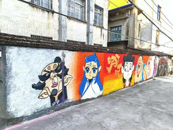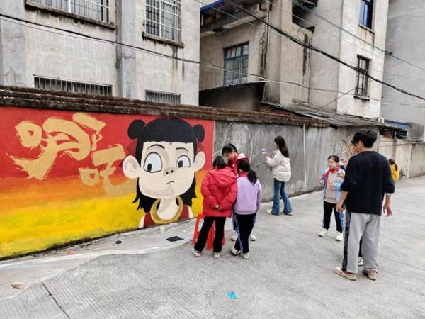老舊社區(qū)“哪吒”出圈,校地融合再升級 3月,三明學(xué)院美術(shù)專業(yè)的五名學(xué)子在三元區(qū)荊西街道派出所繪制了哪吒主題墻繪,迅速成為網(wǎng)紅打卡地,吸引眾多明院學(xué)子和群眾拍照打卡。荊西街道與三明學(xué)院通過共同在老舊社區(qū)進(jìn)行藝術(shù)創(chuàng)作,打響了“老”街區(qū)的“新”名牌。文化墻為后續(xù)吸引更多年輕人到老街區(qū)開展服務(wù)和創(chuàng)作提供了契機(jī),打造了青年發(fā)展的新平臺,更為進(jìn)一步盤活學(xué)院、轄區(qū)優(yōu)質(zhì)資源,招商引資、發(fā)展第三產(chǎn)業(yè)奠定了基礎(chǔ)。