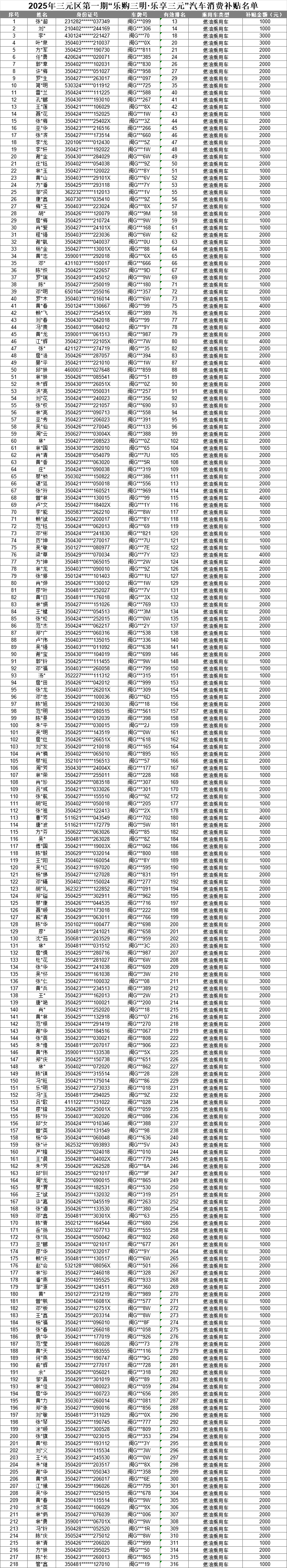 為深入貫徹落實《商務部等8部門辦公廳關于做好2025年汽車以舊換新工作的通知》商辦消費函〔2025〕8號、福建省政府辦公廳《關于<實現(xiàn)2025年一季度經(jīng)濟社會發(fā)展良好開局若干措施>的通知》、《三明市推動大規(guī)模設備更新和消費品以舊換新行動實施方案》(明政規(guī)〔2024〕3號)文件精神,加快推動汽車等大宗消費品以舊換新,進一步提振我市汽車消費市場活力,同時根據(jù)省、市促消費工作部署,三元區(qū)于2025年2月28日—3月7日開展2025年第一期“樂購三明?樂享三元”汽車促消費補貼活動。經(jīng)三元區(qū)商務局、稅務局、公安交警支隊(車管所)聯(lián)合審核,現(xiàn)將218名符合條件申請人名單予以公示。 公示時間:4月2日—4月9日公示5個工作日 公示期間如有異議,請于2025年4月9日前以書面形式向區(qū)商務局反映。若公示無異議,將根據(jù)相關程序進行補貼發(fā)放。 聯(lián)系電話:0598-8265418 通訊地址:三明市三元區(qū)人民政府主樓三樓。 附件:三元區(qū)2025年第一期“樂購三明?樂享三元”汽車促消費補貼活動公示名單