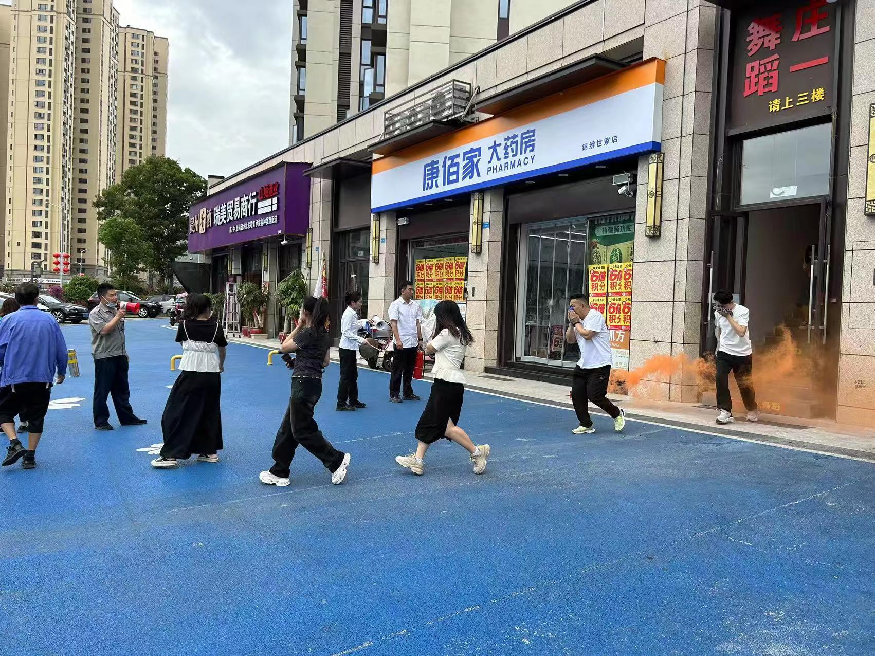 隨后,演練正式開始。現場某商鋪發生火災,現場濃煙滾滾,火勢迅速蔓延。物業工作人員發現火情后,立即撥打119報警,并組織人員疏散顧客。街道社區接到報警后,立即啟動應急預案,組織人員趕赴現場協助疏散人群,并設置警戒線,引導人員轉移至安全地帶。