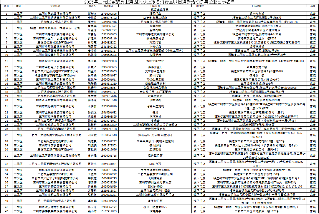 根據三明市商務局印發的《關于征集三明市2025年家裝廚衛“煥新” 補貼活動參與企業的公告》文件精神,經企業自主申報,三元區商務局審核,現將2025年三元區家裝廚衛第四批線上報名消費品以舊換新活動參與企業名單予以公示。公示時間2025年5月28日至5月30日(三個工作日),如有異議,請在公示期內書面形式實名向將三元區商務局反映。 聯系電話:0598-8265418。 附件:2025年三元區家裝廚衛第四批線上報名消費品以舊換新活動參與企業公示名單 三元區商務局 2025年5月27日