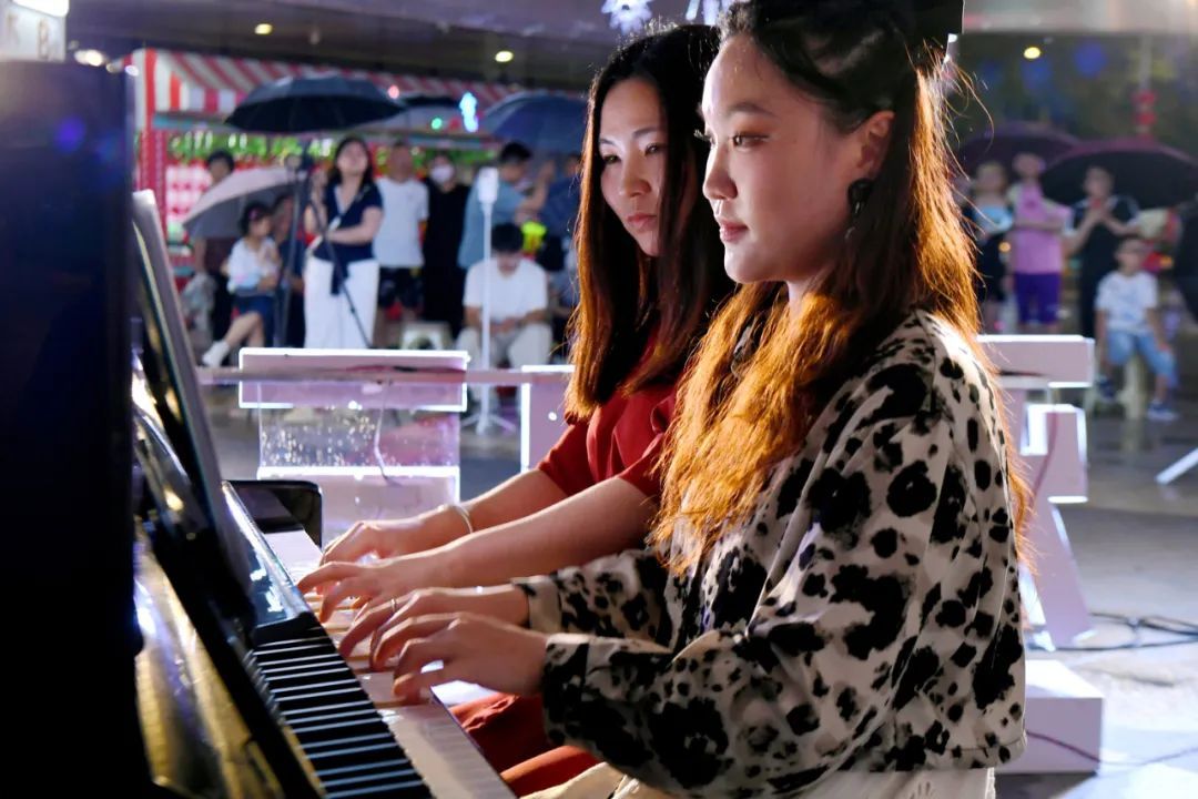 廣場中央,電吹管重奏《世紀春雨》率先以金屬質感的音色劃破夜空。葫蘆絲《紅歌聯奏》的悠揚旋律與古箏《井岡山上太陽紅》的清脆琴音交相輝映,禮贊黨和祖國。《花兒為什么這樣紅》在小提琴中傾訴婉轉情思,鋼琴獨奏《g小調前奏曲》在黑白鍵上流淌出古典詩意,更有四手聯彈《匈牙利舞曲第5號》的激情碰撞......一首首優美的旋律巧借夜色為幕,將三元的夏夜譜寫成流動的城市交響詩。這場無需門票、沒有圍墻的音樂派對,用激昂旋律吹響奮進號角,為黨的生日送上了深情祝福,讓高雅藝術真正“活”在廣大群眾的日常生活,成為一段段值得回味的精神旅程。