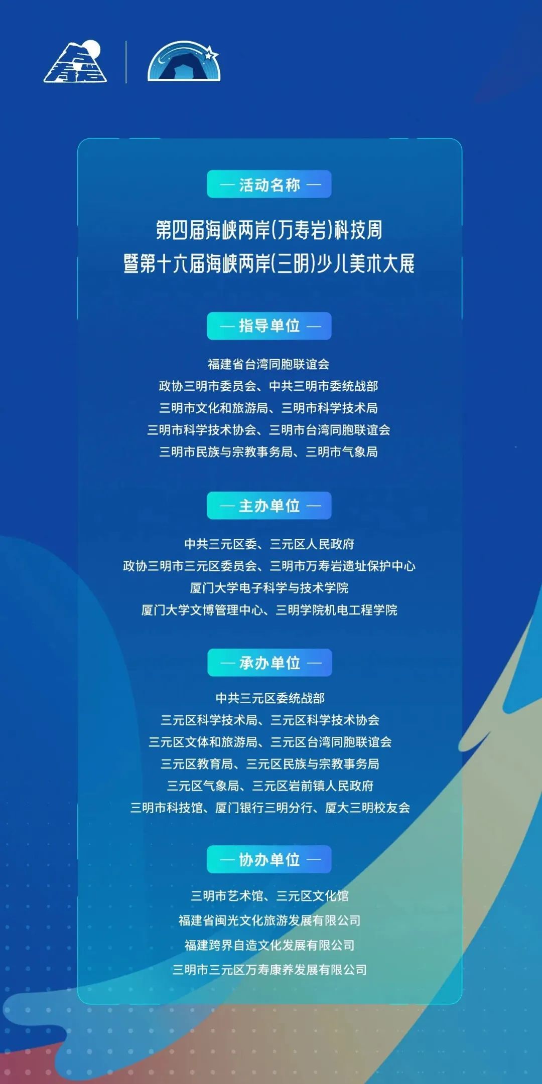 追尋遠古足跡 體驗科創魅力 共賞藝術芬芳 7月4日, 第四屆海峽兩岸(萬壽巖)科技周暨 第十六屆海峽兩岸(三明)少兒美術大展活動在三鋼萬壽巖學院開幕 開幕式上,省臺聯黨組書記劉良輝、市委副書記楊興忠、廈門銀行總行副行長劉永斌、市文旅局長馮火珠、區人大常委會主任林翠玲共同為此次活動敲錘啟動。