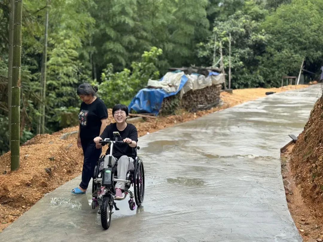 7月11日,對(duì)三明市三元區(qū)中村鄉(xiāng)筠竹村村民陳春花來(lái)說(shuō),是個(gè)難以忘懷的日子。第一次,父親不是站在山腳下等候,而是在山腰的家門口張望,等待她回家。隨著車輪緩緩壓過(guò)水泥路面,陳春花多年夙愿得以實(shí)現(xiàn):這條僅僅150米長(zhǎng)的水泥路,將歸家的路變成坦途。 12年前,還沉浸在大學(xué)畢業(yè)喜悅中的春花,不幸因系統(tǒng)性紅斑狼瘡并發(fā)急性橫貫性脊髓炎,導(dǎo)致下半身癱瘓,生活無(wú)法自理。巨大的打擊讓她心灰意冷,將自己封閉在家中長(zhǎng)達(dá)9年。 2022年,三明市希望之家助殘服務(wù)中心創(chuàng)始人謝啟明的出現(xiàn),為她昏暗的生活帶來(lái)了光亮。在他的鼓勵(lì)和支持下,春花鼓起勇氣走出家門,參加了脊髓損傷者生活重建訓(xùn)練營(yíng)。在這里,她與脊髓損傷的伙伴一起堅(jiān)持訓(xùn)練、互相鼓勵(lì)。勤奮與堅(jiān)持,不僅讓她練就了獨(dú)立生活的技能,也在希望之家收獲了一份工作。這位堅(jiān)強(qiáng)的姑娘以“同儕教練”的身份,將自己收獲的溫暖,傳遞給其他脊髓損傷者,幫助他們重燃希望。