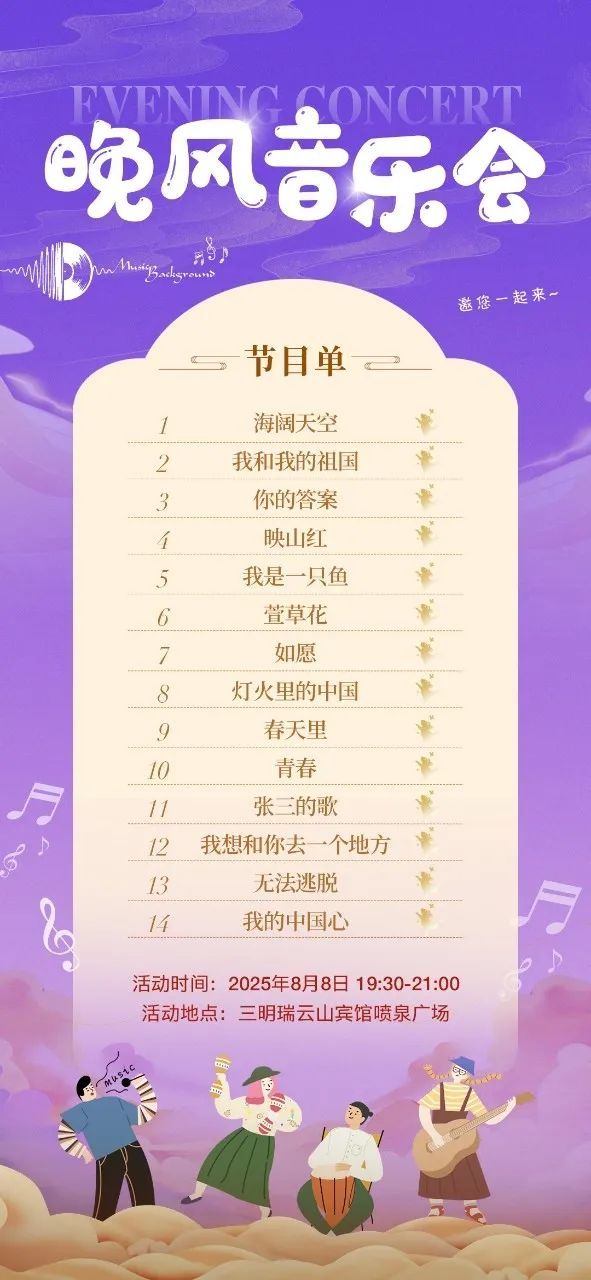 上周五的音樂(lè)會(huì)還讓你們意猶未盡? 7點(diǎn)30分 來(lái)瑞云山噴泉廣場(chǎng) 本周精彩繼續(xù)! 讓音樂(lè)驅(qū)散暑熱 喚醒自由靈魂