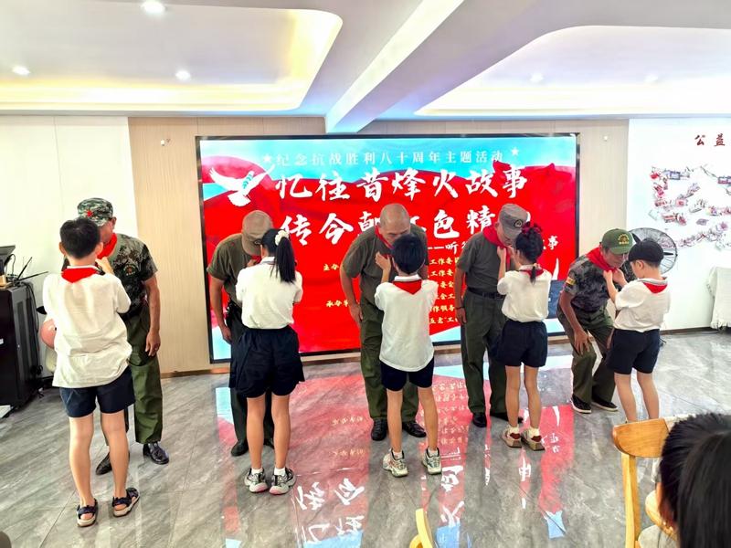 少先隊員們在這難忘的時刻為老兵們佩戴紅領巾。老少同框的畫面令在場的領導、家長和志愿者們無不動容。