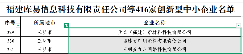 近日,福建省工信廳發布創新型中小企業名單,我區天泰(福建)新材料科技有限公司、福建省廣明涂料有限責任公司、三明五九八網絡科技有限公司等3家企業上榜。