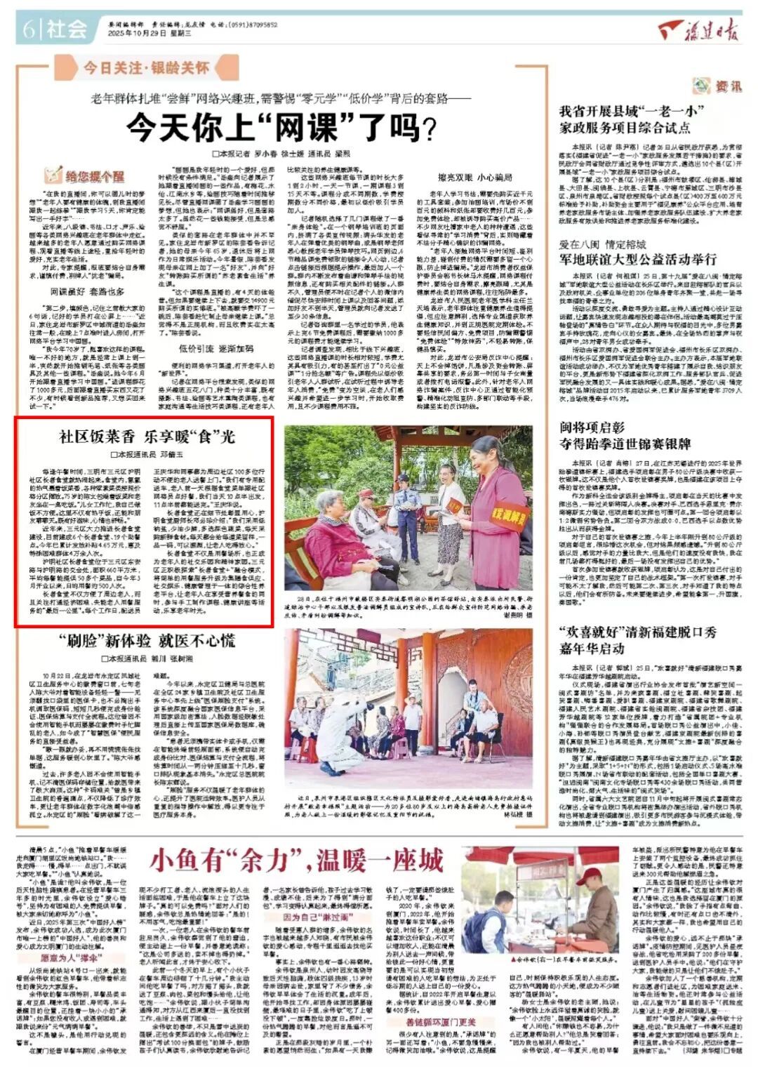 長者食堂不僅方便了周邊老人,而且關注打通經(jīng)濟困難、失能老人用餐服務的“最后一公里”。每個工作日,配送員王慶華和同事都為周邊社區(qū)100多位行動不便的老人送餐上門。“我們有專用配送車,老人前一天根據(jù)食堂菜單跟社區(qū)網(wǎng)格員點好餐,我們當天10點半出發(fā),11點半前都能送完。”王慶華說。 長者食堂還在細節(jié)處彰顯用心,滬明食堂廚師長鄧必珍介紹:“我們采用低鈉鹽,少油少辣,多選深色蔬菜,每天采購新鮮食材。每天都會給每道菜留樣,一品一碼,可以溯源,讓老人吃得放心。” 長者食堂不僅是用餐場所,也正成為老年人的社交樂園和精神家園。三元區(qū)正積極探索“長者食堂+”融合模式,將簡單的用餐服務升級為集膳食供應、社交娛樂、健康管理于一體的綜合性養(yǎng)老平臺,讓老年人在享受營養(yǎng)餐食的同時,參與手工制作課程、健康講座等活動,樂享老年時光。 |